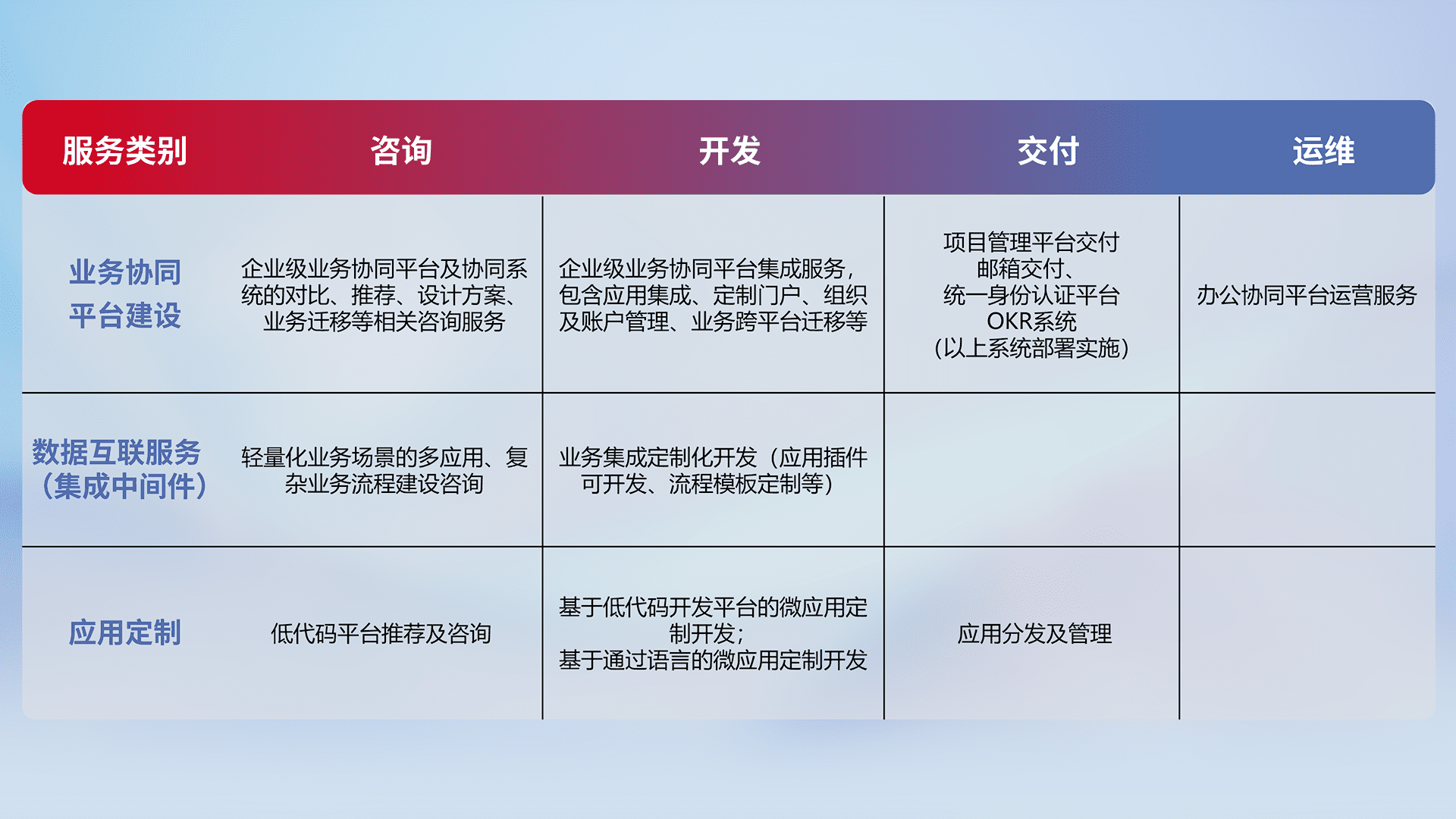 针对钉钉、、、企微、、IDaas等平台级产品提供产品的规划、、、方案、、、、交付、、定制化开发等服务,,,,实现如统一协同办公、、、、智能客户服务、、、混合会议管理、、、、智能数据查询、、、、等业务场景,,,,实现数字化转型。。