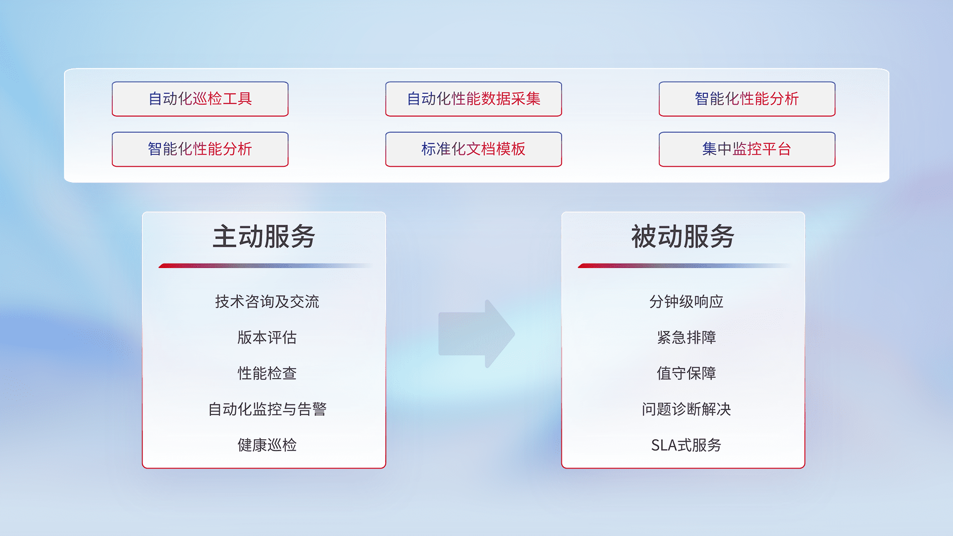 智能化工具和标准化文档,,,保障服务质量,,提供主动服务(包含技术咨询、、版本评估、、、性能检查、、、自动化监控与告警、、健康巡检)和被动服务包含(分钟级响应、、、、紧急排障、、、值守保障、、、、问题诊断解决、、、SLA服务)。。
